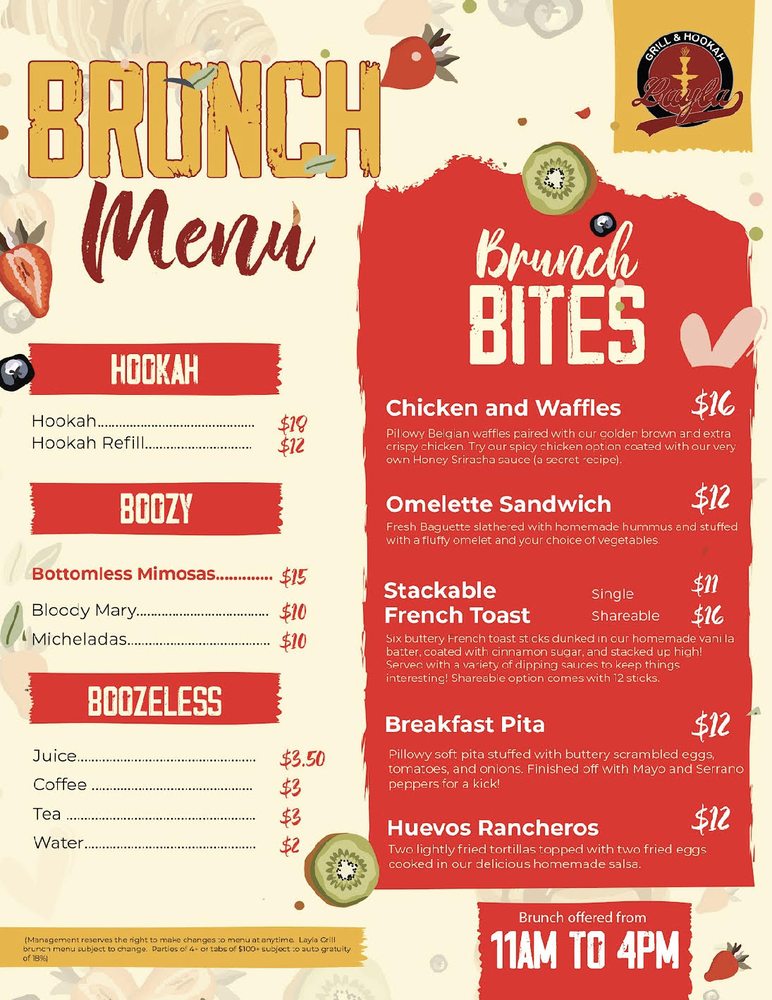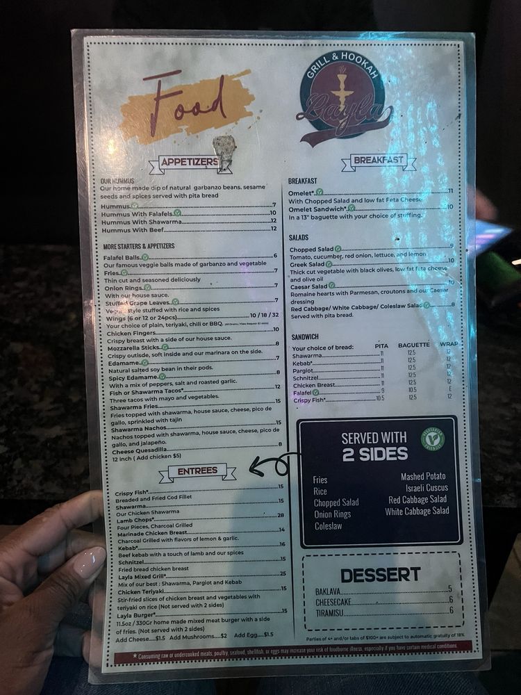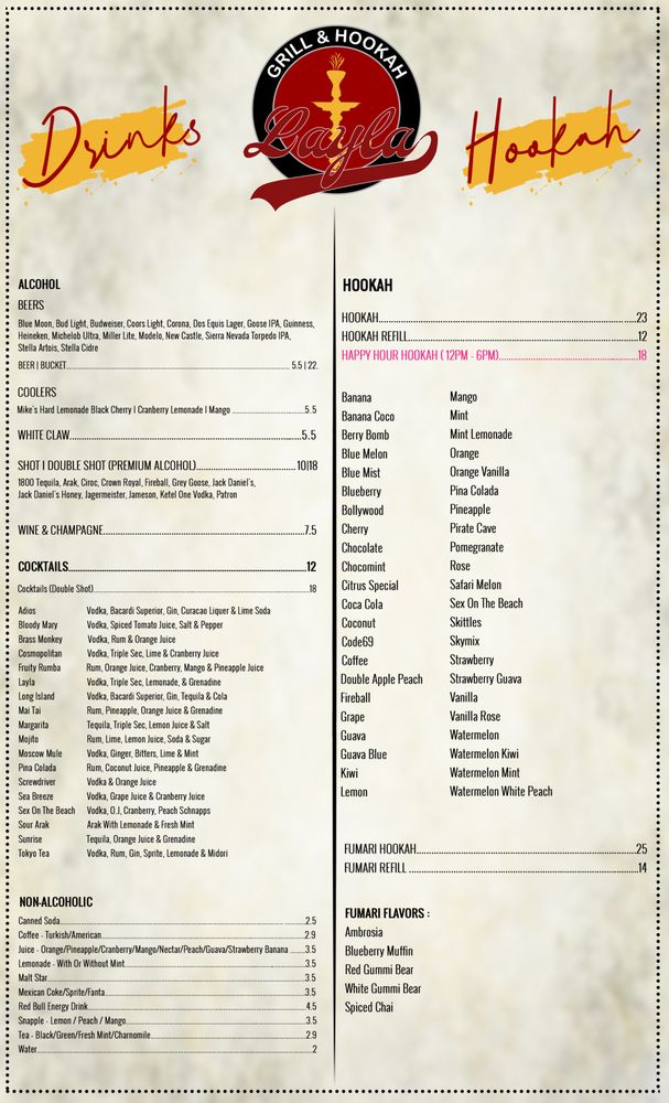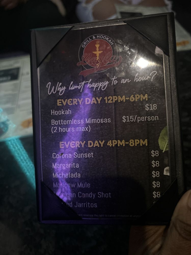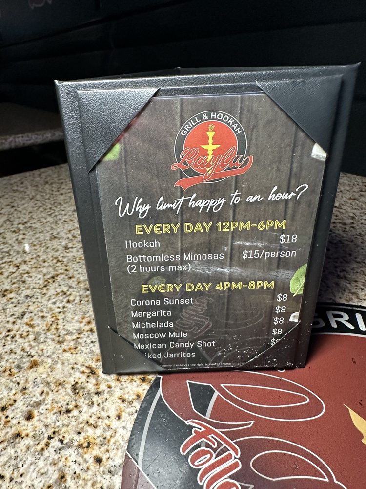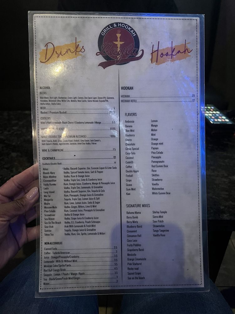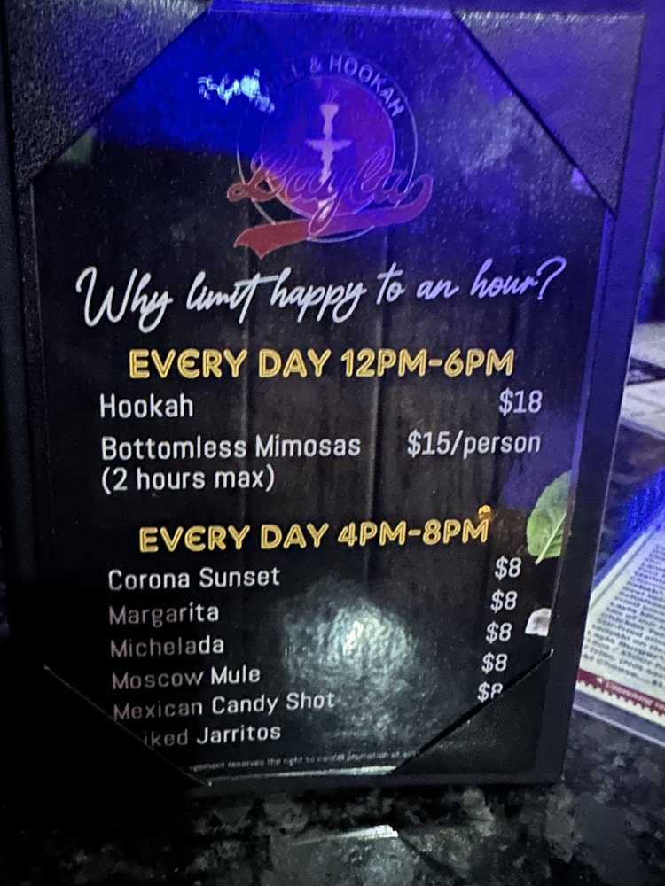 Layla Grill & Hookah offers a unique dining experience with a focus on hookah and delicious Mediterranean-inspired cuisine. Located in Las Vegas, this restaurant provides a casual yet vibrant atmosphere, perfect for a night out with friends. The menu boasts vegan and vegetarian options, along with flavorful dishes like falafel, hummus, chicken shawarma, and loaded fries. Customers rave about the creative cocktails, diverse hookah flavors, and affordable happy hour specials. The restaurant also features TV screens, outdoor seating, and a groovy lounge setting. With friendly service and a chill urban vibe, Layla Grill & Hookah is a must-try spot for those looking for a fun and relaxed evening.